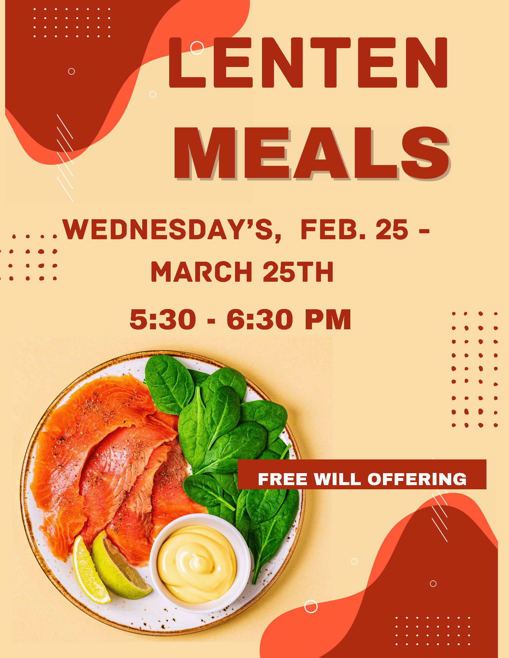 Lenten Meals Served Wednesdays February 25 – March 25, 2026 5:30 – 6:30 PM. Free Will Offering.
