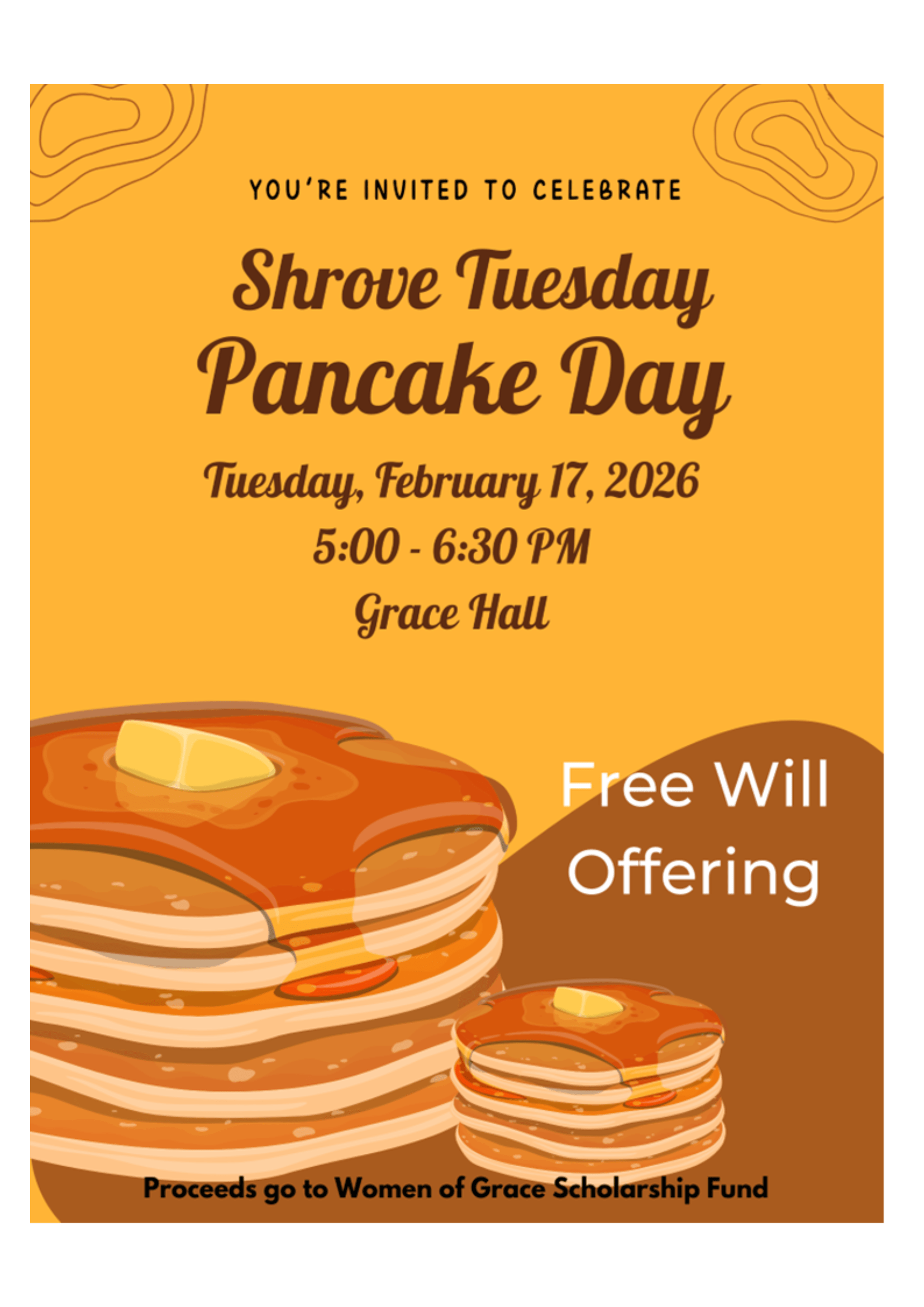 Shrove Tuesday Pancake Day Tuesday February 17, 2026 5:00 – 6:30 PM. Free Will Offering.